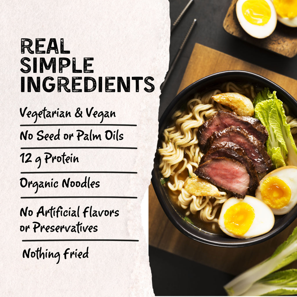 This is instant ramen as you've never had it before. Our broths are ridiculously rich, perfectly seasoned, and made with simple ingredients. They just so happen to also have way less sodium than the leading instant ramen. Our noodles aren't flash fried. They're steamed and organic and made in-house each day in our California factory.