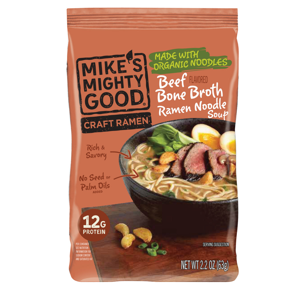 Mike's Mighty Good has the recipe for your ultimate comfort food. This beef bone broth ramen noodle soup is ready in minutes and made with rich-tasting bone broth, no seed or palm oils, organic scratch-made noodles, 12g protein, and way less sodium than conventional ramen. No artificial ingredients. No artificial preservatives. It's made in the USA with the use of solar power.