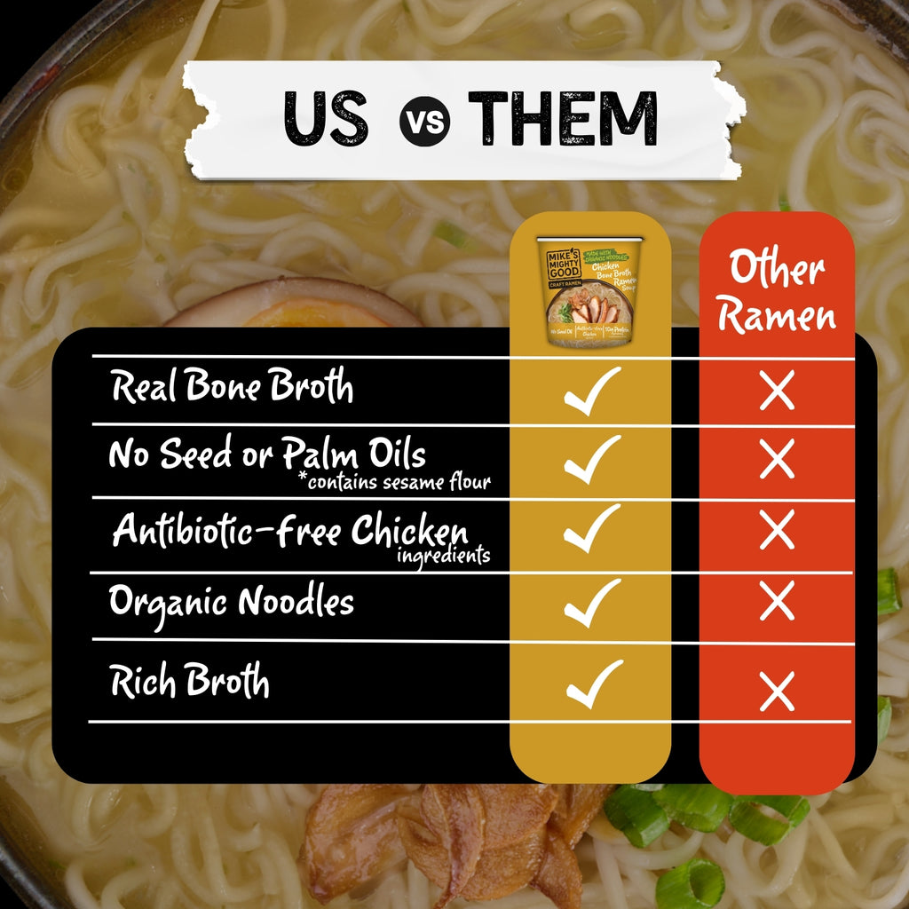 Get ready to meet the ultimate comfort food: the world’s best Chicken Bone Broth Ramen Noodle Soup. This rich, decadent instant ramen soup cup is ready in just minutes, yet tastes just like the best bowl of ramen at a ramen bar. Enjoy it on its own or top it with your favorite ramen toppings like chicken breast cutlets, fried garlic, and green onions.