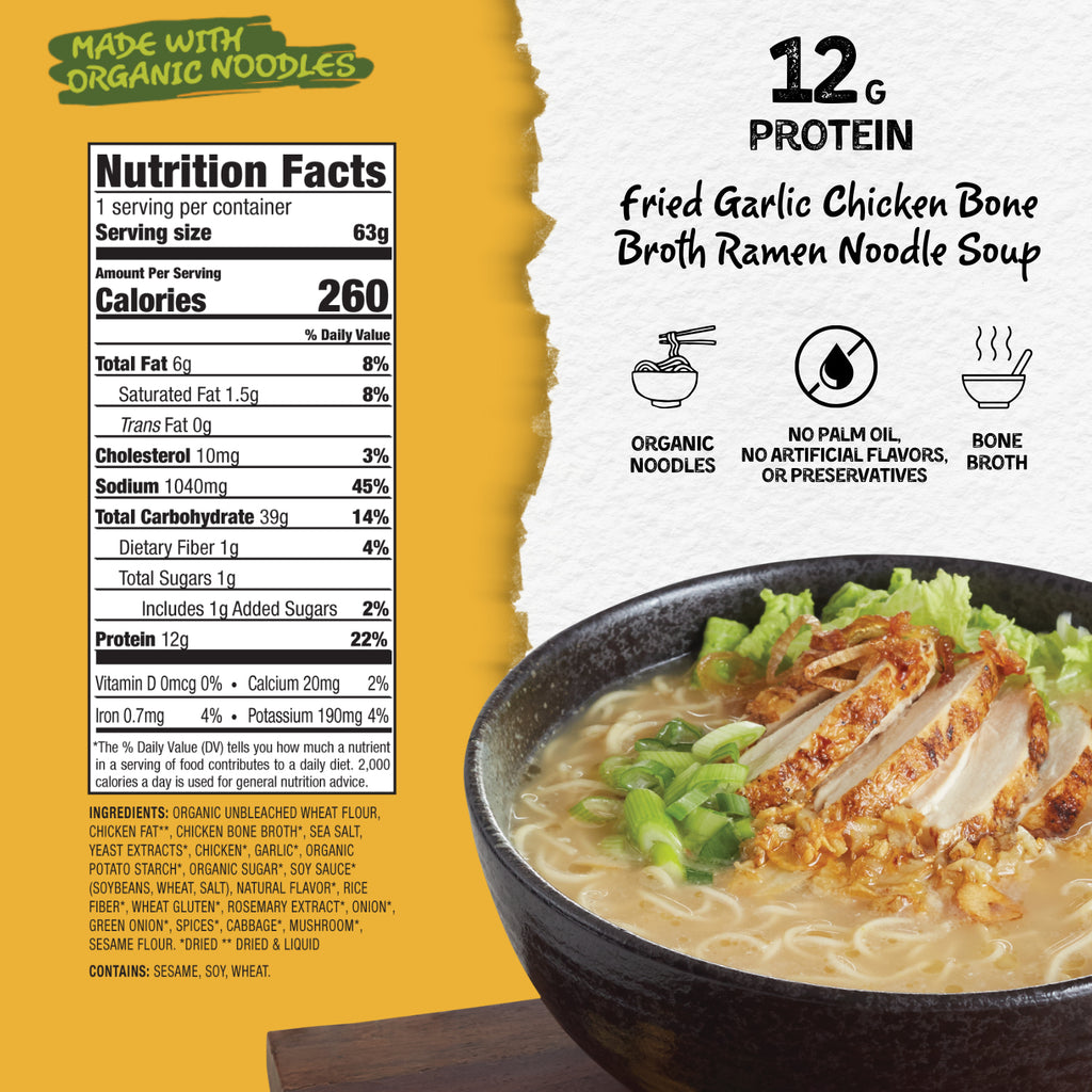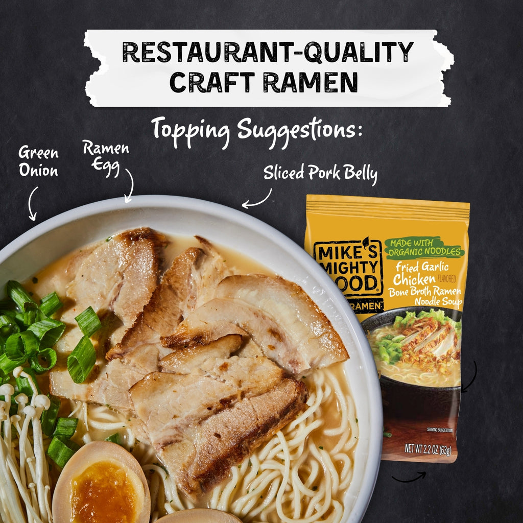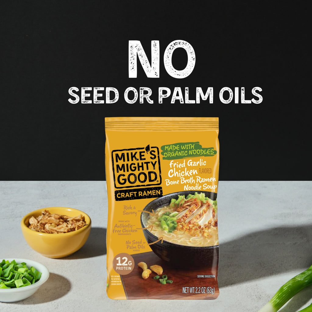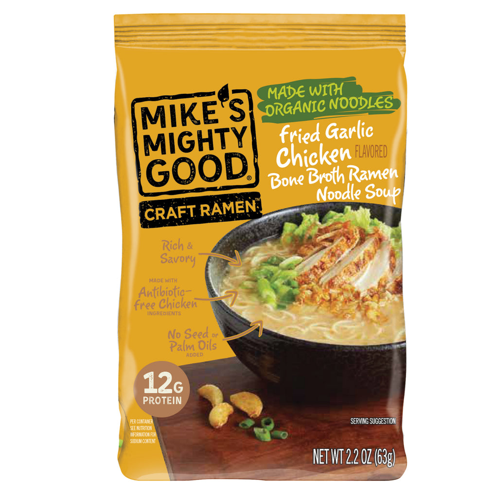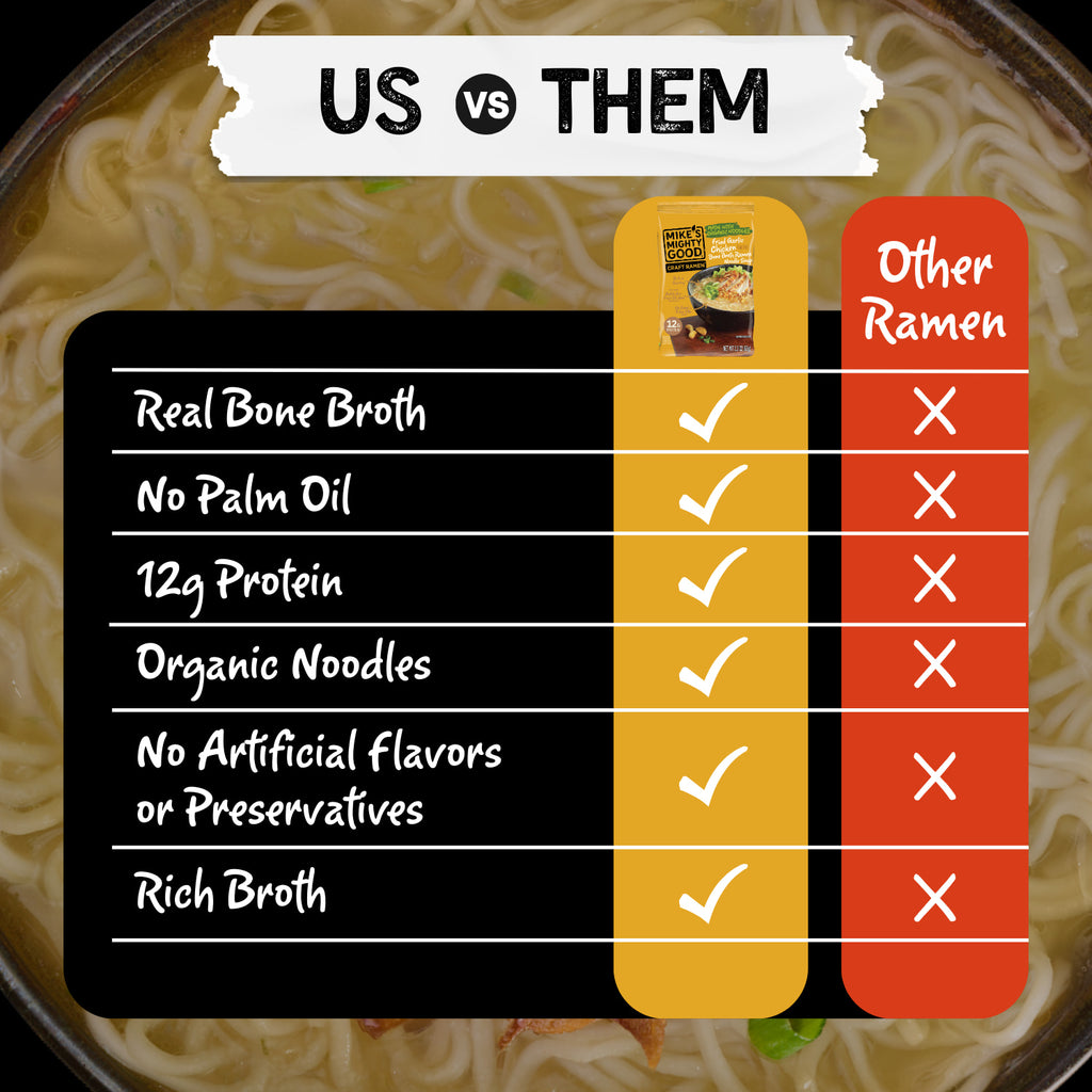 Mike's Mighty Good has the recipe for your ultimate comfort food. This garlic chicken bone broth ramen noodle soup is ready in minutes and made with rich-tasting bone broth, no seed or palm oils, antibiotic-free chicken, organic scratch-made noodles, 12g protein, and way less sodium than conventional ramen. No artificial ingredients. No artificial preservatives. It's made in the USA using solar power.