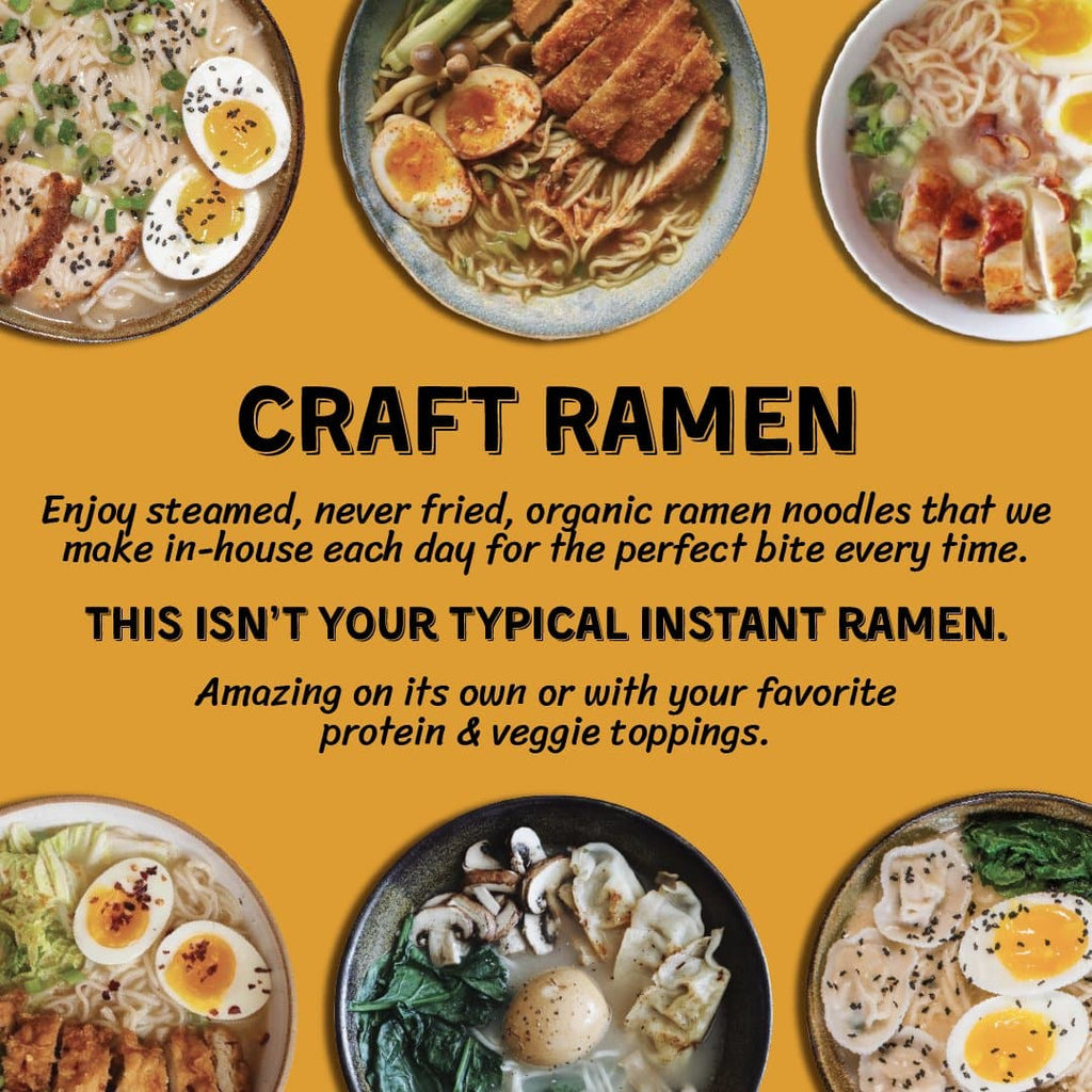 People are often surprised that an instant ramen can be so good. This is not like the ramen of college years past. We have ridiculously rich broth, simple ingredients, not too salty, and steamed (not fried) Organic ramen noodles we make in-house from scratch.