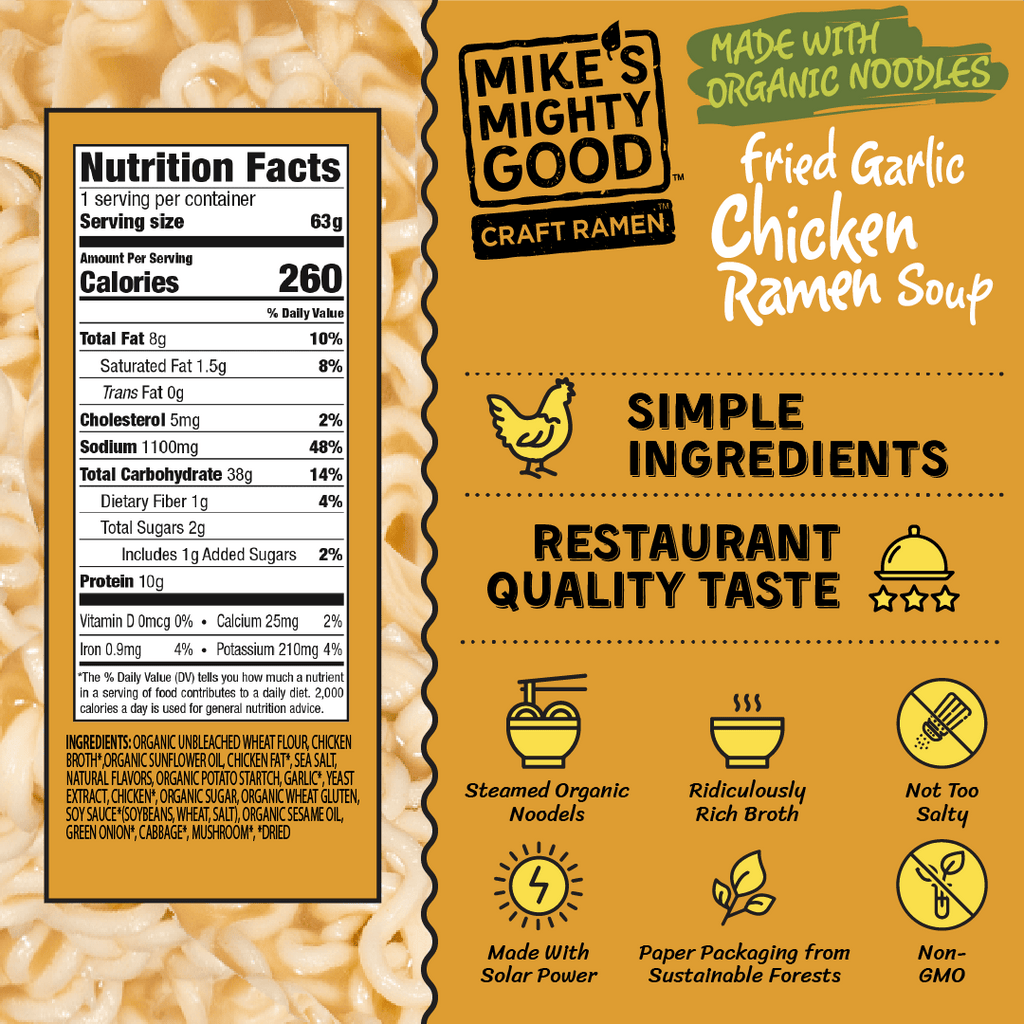 Mike's Mighty Good has the recipe for your ultimate comfort food. This garlic chicken bone broth ramen noodle soup is ready in minutes and made with bone broth, no palm oils, antibiotic-free chicken ingredients, organic scratch-made noodles, and way less sodium than conventional ramen. Made with the use of solar power.