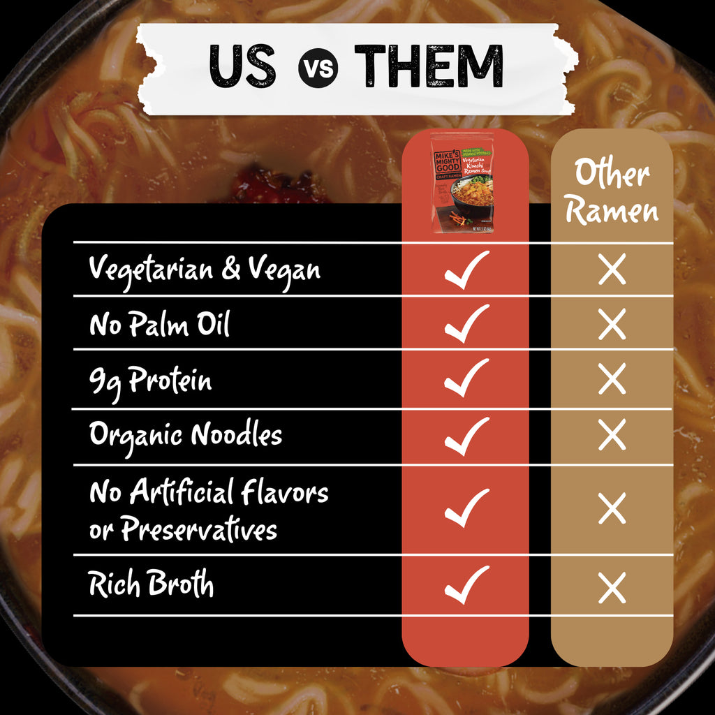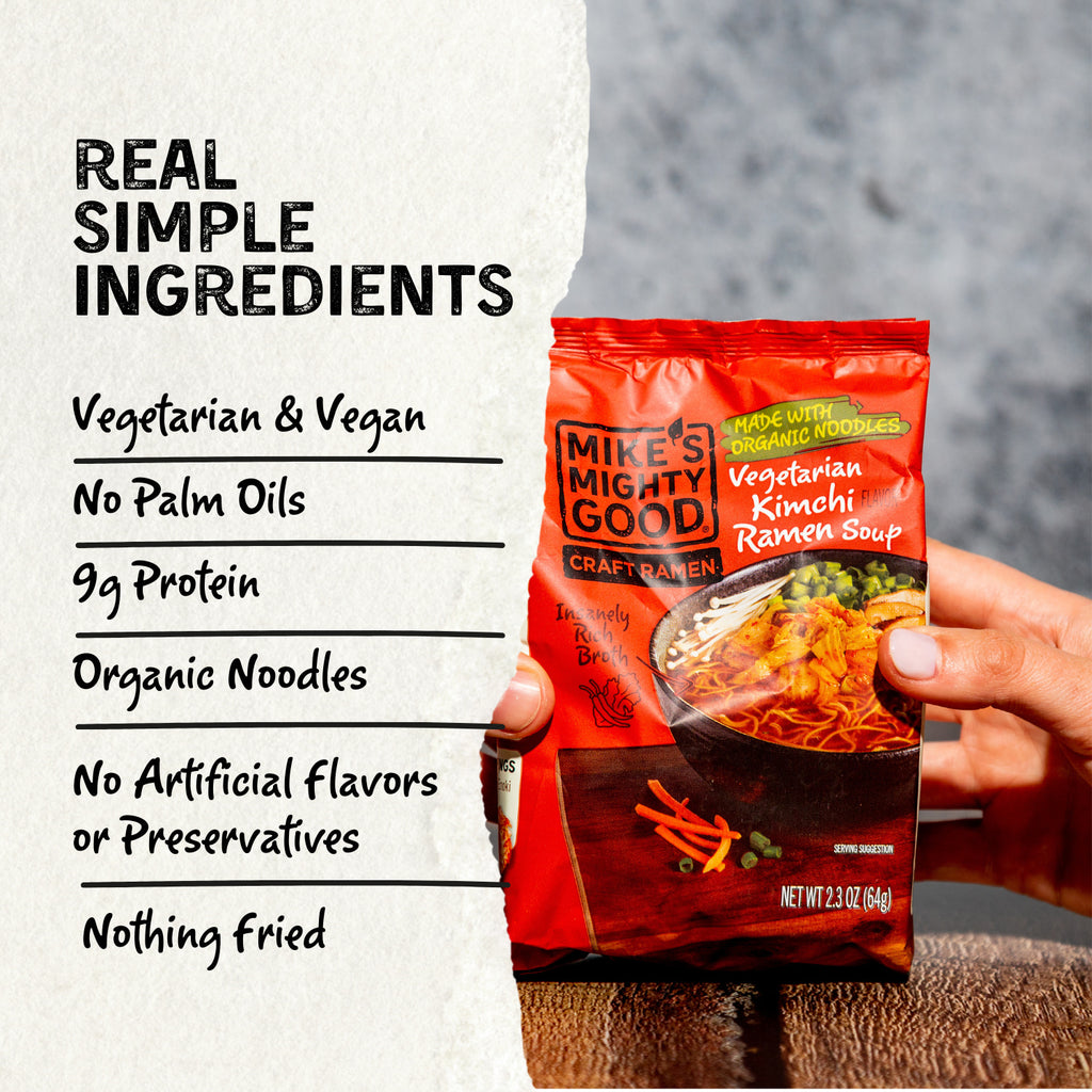 Read moreMike's Mighty Good has the recipe for your ultimate comfort food. This vegetarian & vegan kimchi ramen noodle soup is ready in minutes and made with rich-tasting broth, no palm oils, organic scratch-made noodles, 9g protein, and way less sodium than conventional ramen. No artificial ingredients. No artificial preservatives. It's made in the USA with the use of solar power.