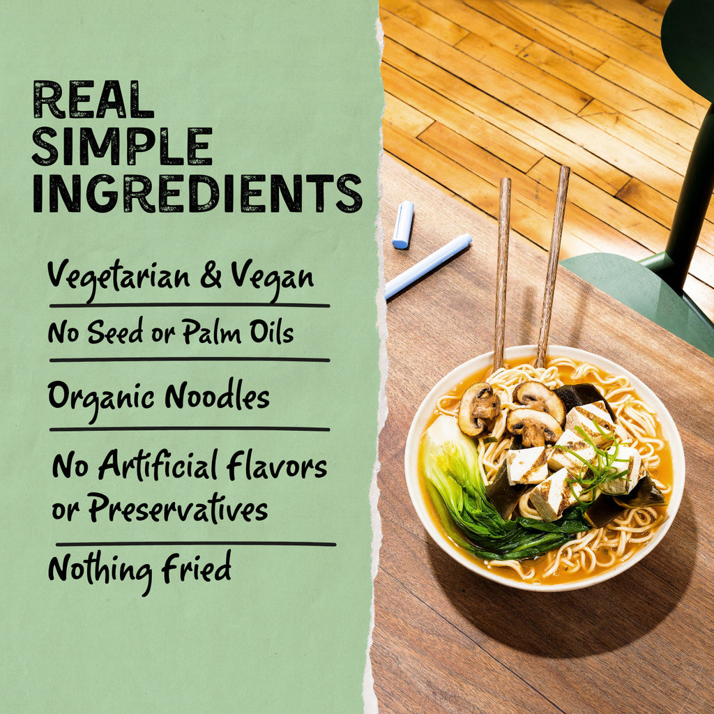 This is instant ramen as you've never had it before. Our broths are ridiculously rich, perfectly seasoned, and made with simple ingredients. They just so happen to also have way less sodium than the leading instant ramen. Our noodles aren't flash fried. They're steamed and organic and made in-house each day in our California factory.