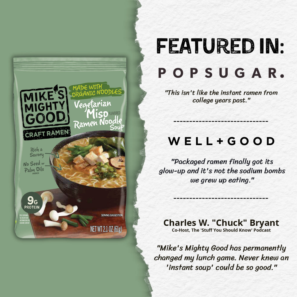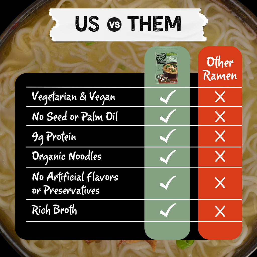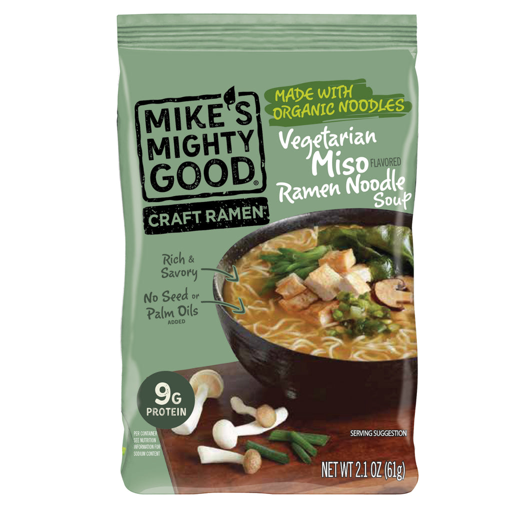 Mike's Mighty Good has the recipe for your ultimate comfort food. This vegetarian & vegan miso ramen noodle soup is ready in minutes and made with rich-tasting broth, no seed or palm oils, organic scratch-made noodles, 9g protein, and way less sodium than conventional ramen. No artificial ingredients. No artificial preservatives. It's made in the USA with the use of solar power.